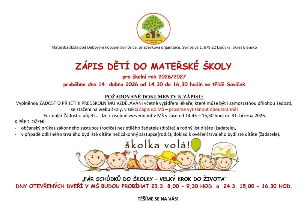 Zápis dětí do MŠ pod Dubovým kopcem Svinošice