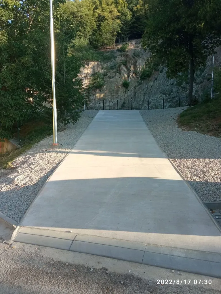 Po zhotovení betonového povrchu jsme pokračovali v terénních úpravách okolí a to srovnání okolí a navezení hrubého štěrku, byly dokončeny elektrorozvody včetně zprovoznění světel. Ještě nás čeká vybrat odpovídající ekologická světla na nesvětlení samotného skalního masivu.